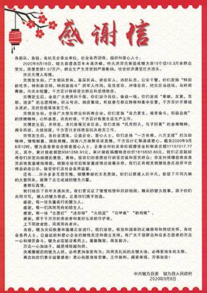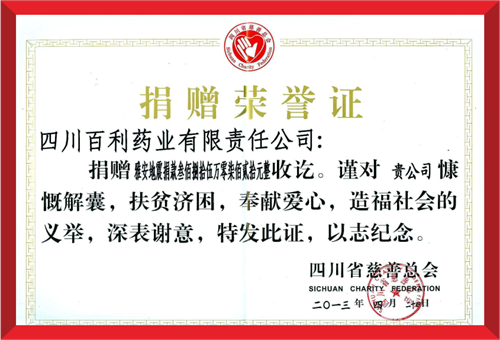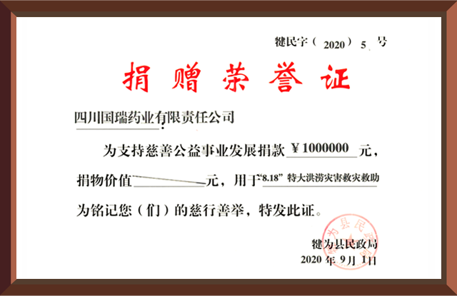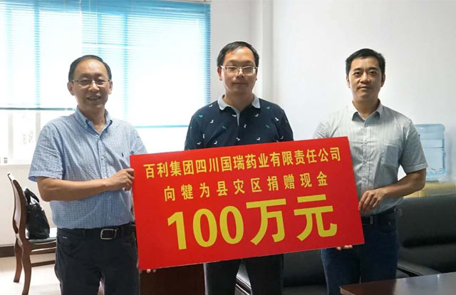 2020年8月18日,四川省犍為縣遭遇百年未遇特大洪澇災(zāi)害,百利集團(tuán)國(guó)瑞藥業(yè)向犍為縣災(zāi)區(qū)捐贈(zèng)現(xiàn)金100萬元。